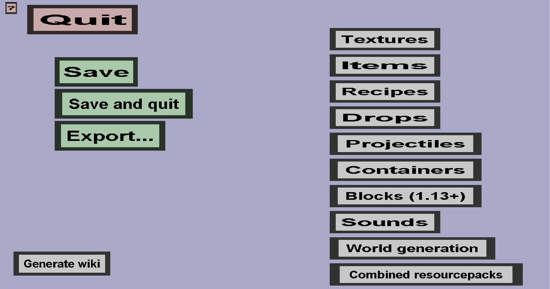 Then there are the buttons for editing the item set. Currently, these are 'Textures', 'Items', 'Recipes', 'Drops', 'Projectiles', 'Containers', 'Blocks', 'Sounds', 'World generation', and 'Combined resourcepacks'. Each button will bring you to a submenu dedicated to those objects in the item set. Those submenus are:
