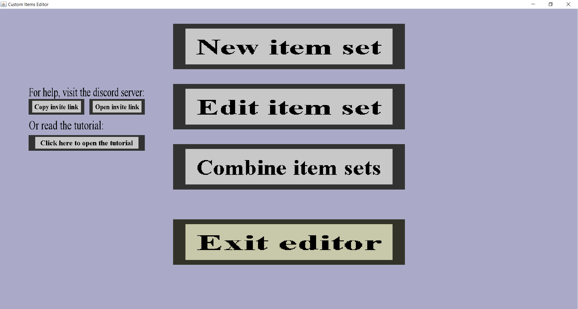 At the time of writing this (Editor 6.0), there are 4 big buttons and 3 small buttons. The 'New item set' and 'Edit item set' are the most important ones. The only purpose of the editor is to design item sets and to generate the files needed by the plug-in. The plug-in can use only 1 item set (at the same time), so most people will only need 1 item set. As the name suggests, the 'New item set' button will bring you to the item set creation menu and the 'Edit item set' button will bring you to the item set selection menu where you can choose an existing item set to edit. If you are using this for the first time, you should create a new one because there is no existing one to edit.