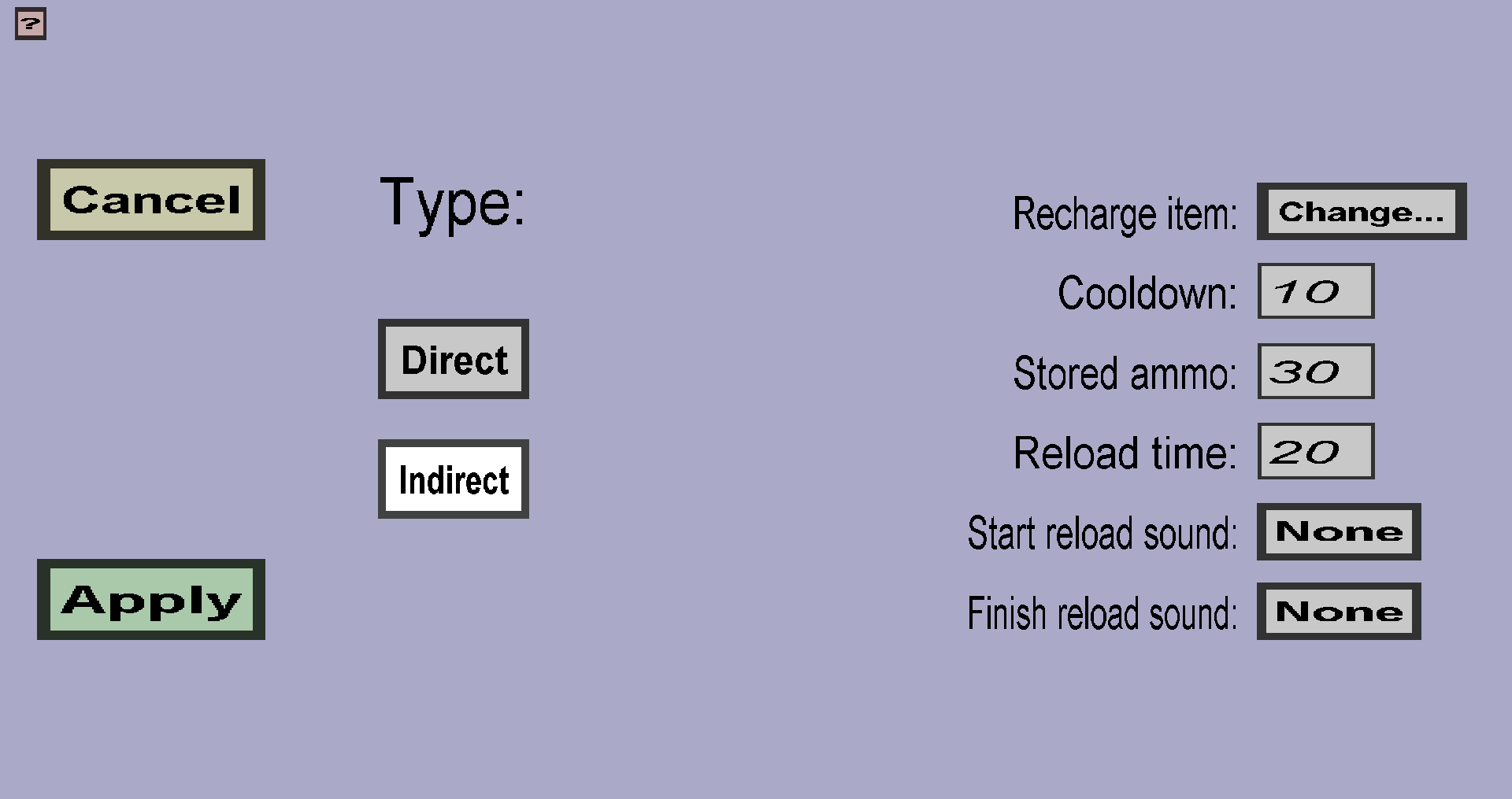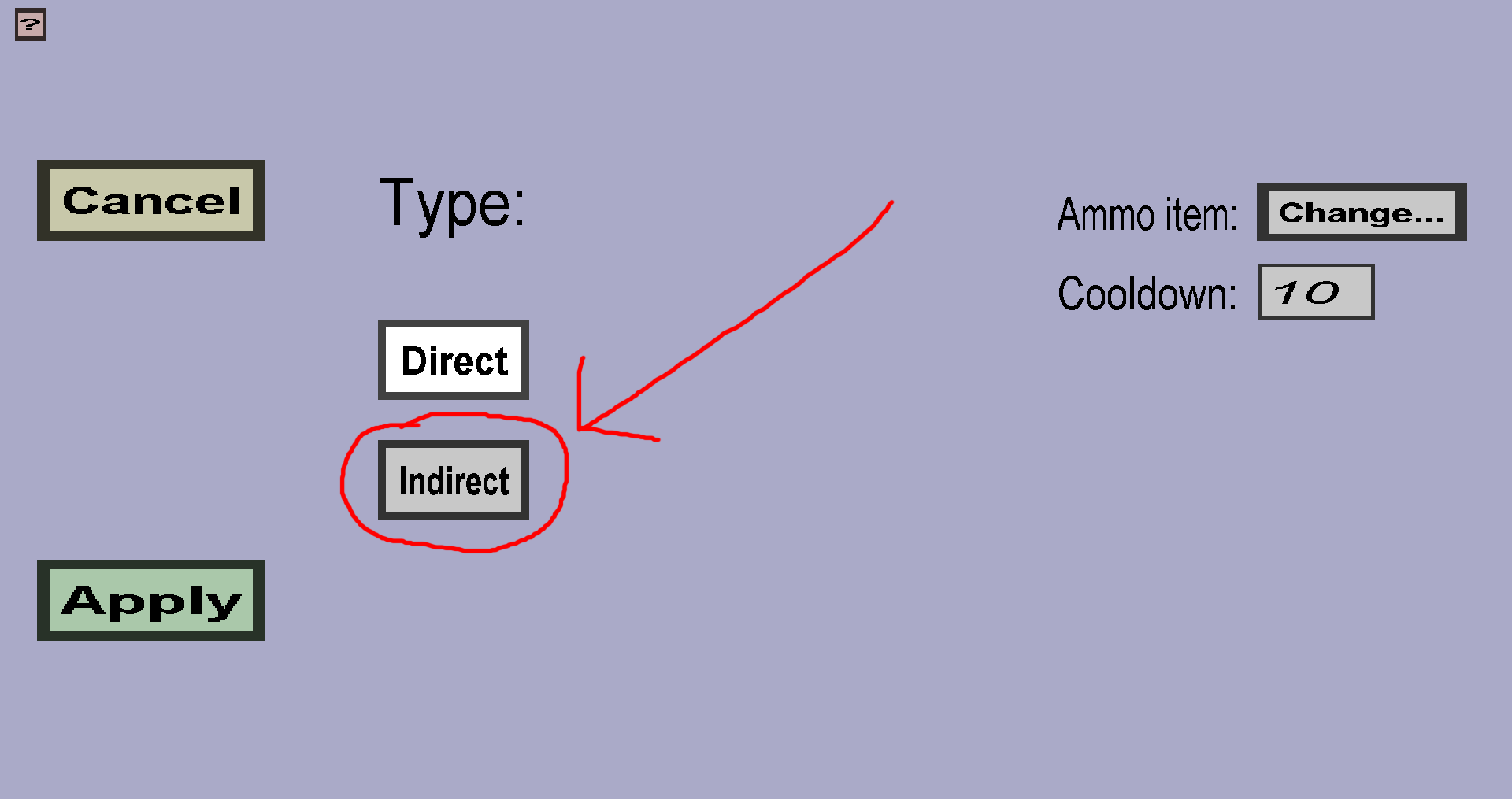 Now its time to create the second gun. This gun will be similar to the first one, but it will get indirect ammo (and a slightly different name and texture). Start by following the same steps as you did for the first (direct) gun. But, when you configure the ammo system, click on the Indirect button: