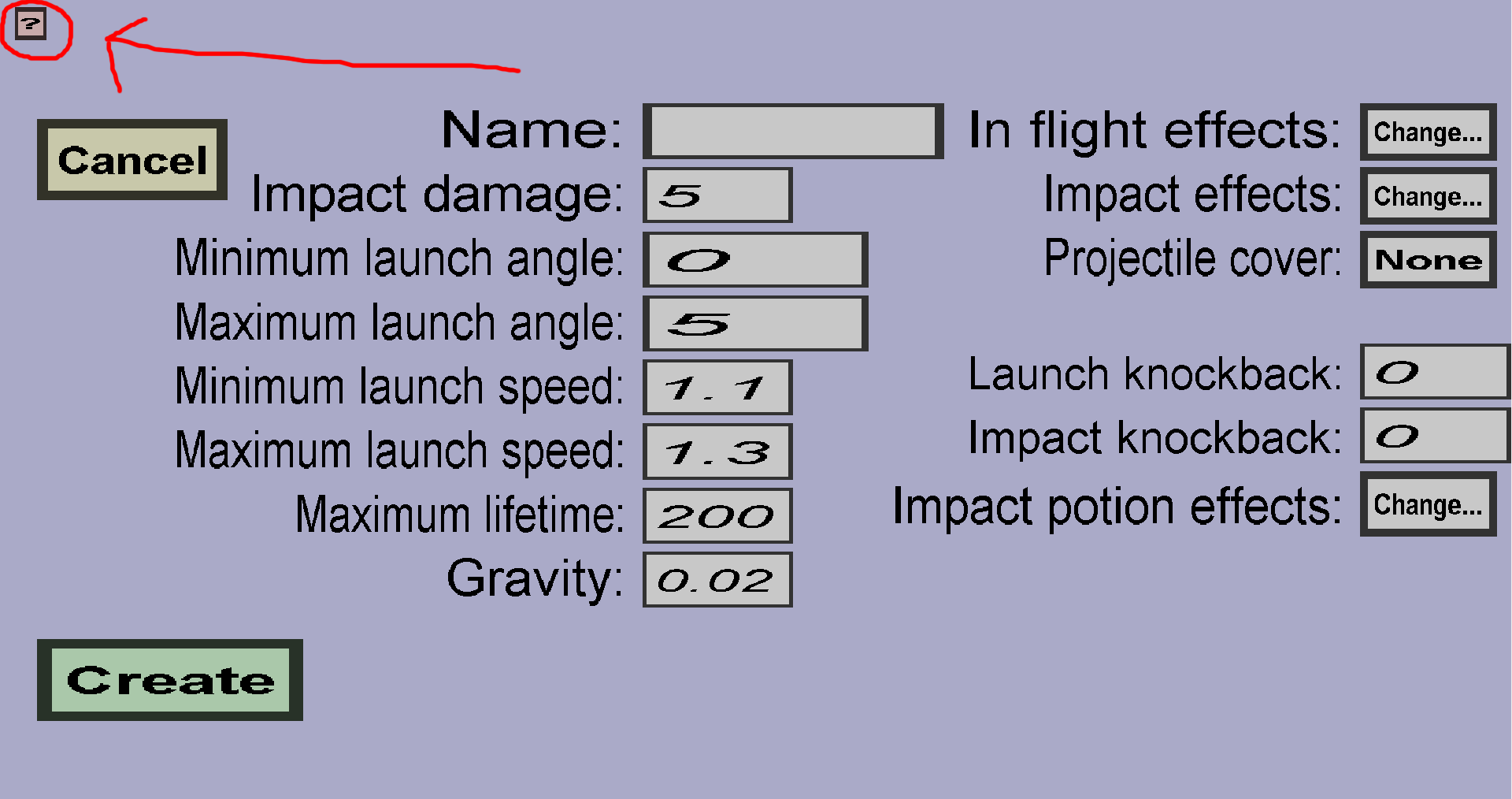 There are many properties of the projectile that you can configure here, but only the Name is required. All custom projectiles must have a distinct name, but other than that, the name matters very little. Click the question mark on the top-left of the page for information about the other properties: