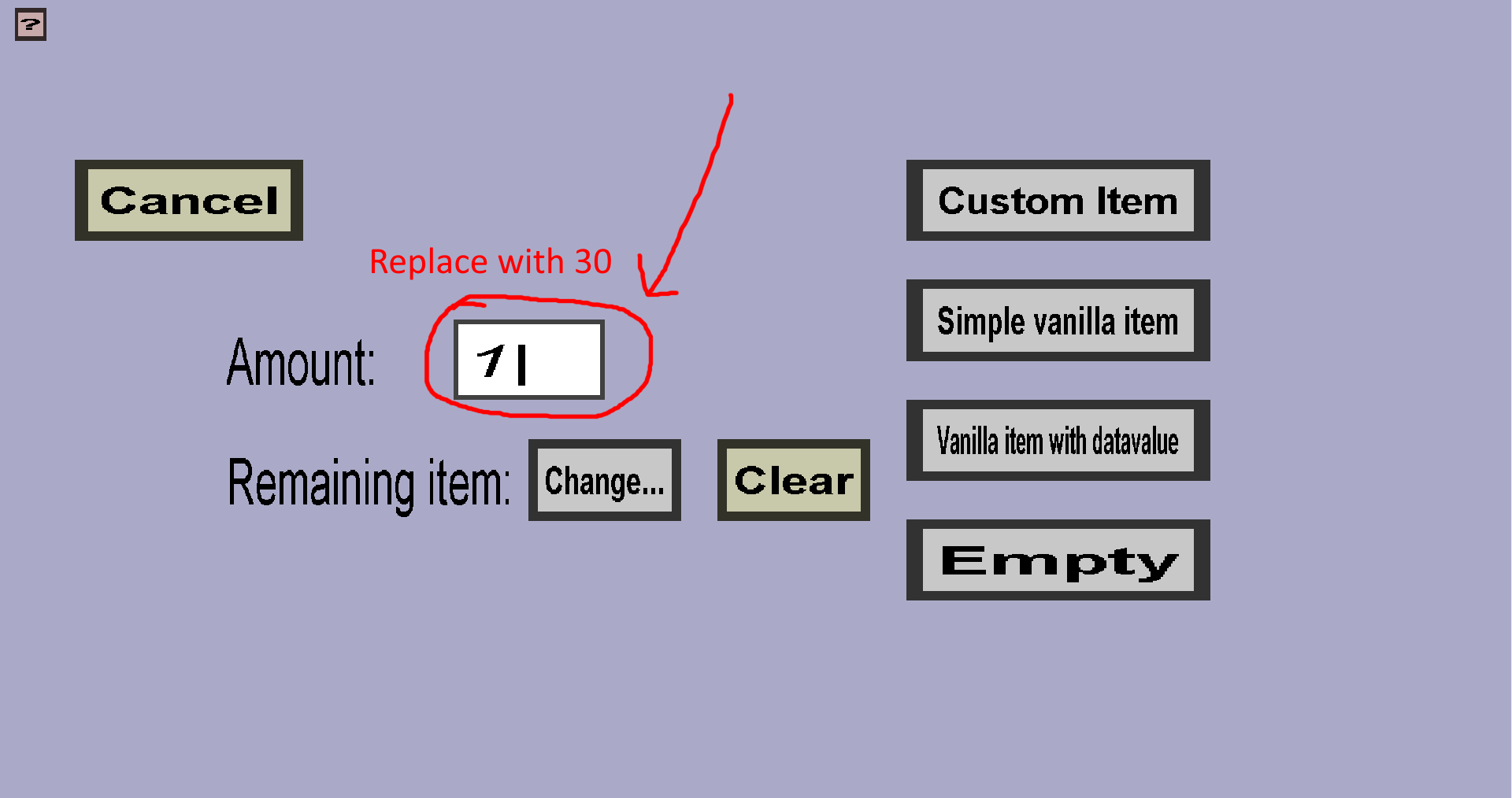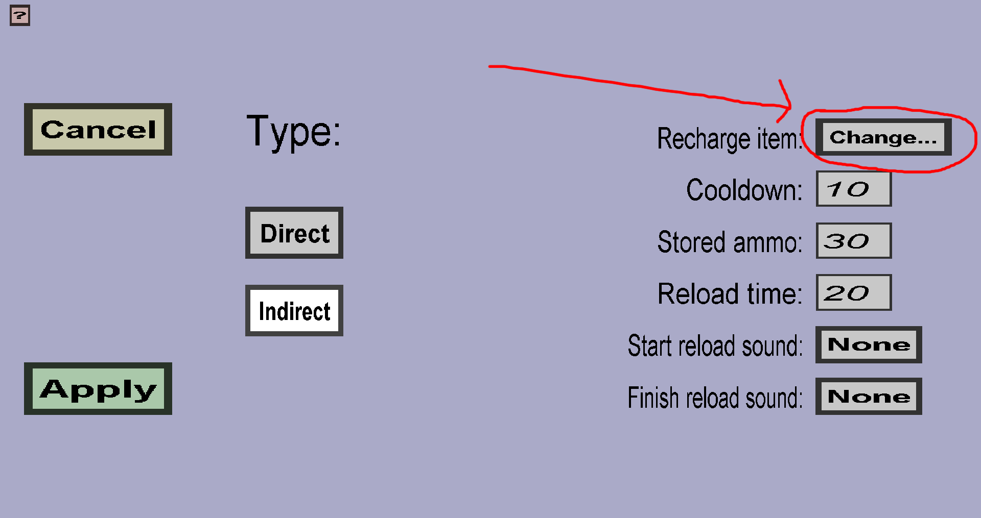 Indirect guns need to be loaded before they can shoot. Loading an indirect gun takes time and/or consumes items from the players inventory. The Recharge item is the item that will be consumed (and required) to load the gun. If you don't choose a recharge item, loading the gun won't cost any items; it only takes time. (This is how ammo works in the game Overwatch). In this tutorial, I will use 30 flint as recharge item. To do so, follow these steps: